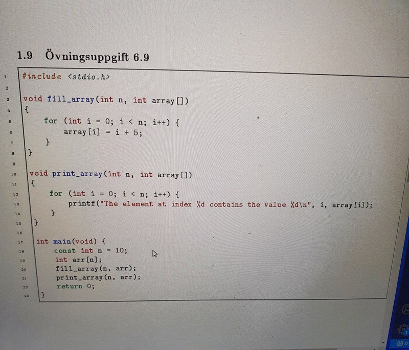 Fråga 1: Funktionerna fill_array och print_array antopades i main. Meeen varför skriver de arr ?? Alltså de skriver i main fill_array (n, arr) och inte fill_array (n, array[]) ?? För att i själva funktionen fill_array står int array så borde det inte stå array även i main funktionen???