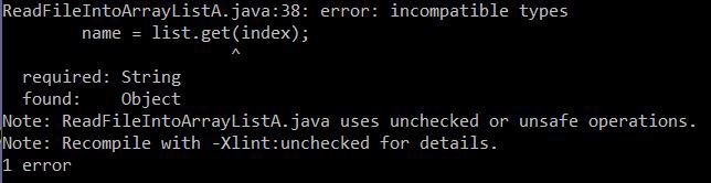 Hursomhelst så är ArrayList list i findname(...) inte specificerad som en <String>-lista vilket inte är några problem när det kommer till sätta in strängar i listan eftersom jag antar att java castar dem till Object men när du försöker rycka ut objekt från list som inte längre har sträng-typ och sätta in dem i index som har strängtyp så får du ett fel som ju lyder explicit "du försöker sätta in ett värde med Object-typ i en variabel med Strängtyp och det går inte.