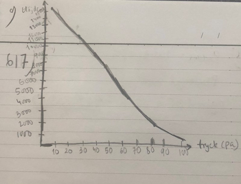 Har fastnat på d & e i uppgiften 617. I d tänker jag att lufttrycket som man ska räkna med är 101 300Pa, detta ska delas med 2 2 ggr alltså delas med 4. Trycket ska alltså bli 101 300Pa/4=25325Pa