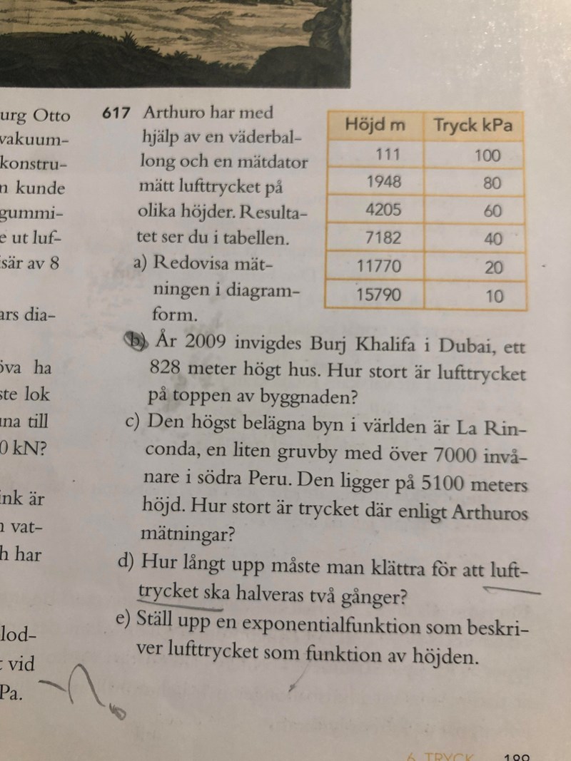 förstår inte hur jag ska göra. Kan vi börja med d uppgiften? Det står att lufttrycket kommer att halveras 2 ggr, vilket lufttryck syftar man på? ska man dela med 2 2ggr?