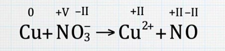 En nitratjon oxideras till kväveoxid. Den är inte en åskådarjon, eftersom den deltar i reaktionen. Andra nitratjoner, som inte deltar i reaktionen (men spm behöver finnas där för att det skall kunna bildas kopparnitrat när vattnet avdunstar) är åskådarjoner.