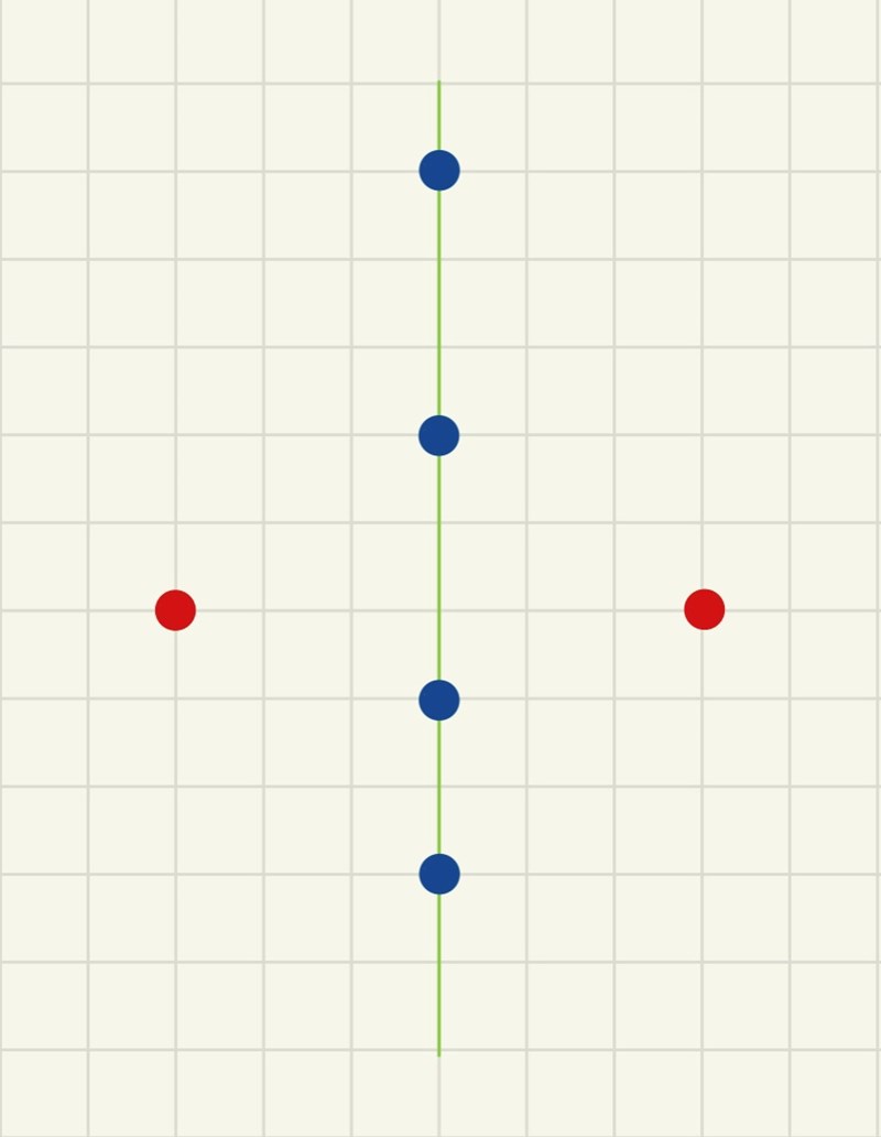 De röda är två godtyckliga punkter i planet. De blåa är punkter som har samma avstånd till båda de röda punkterna. Ser du att alla blåa ligger på en viss linje?