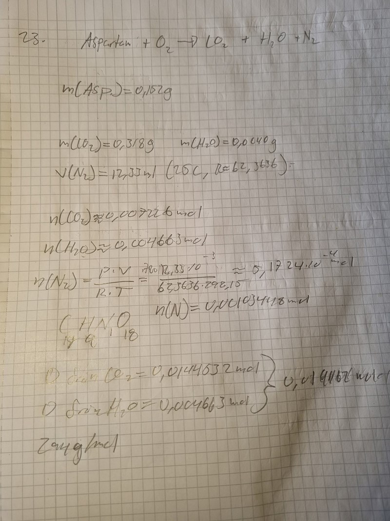 Vid en förbränningsanalys av 0.152 g av sötningsmedlet Aspartam bildades 0.318 g koldioxid, 0.0840 gvatten och 12.33 ml kvävgas (vid 25 oC och 780. mmHg). Bestäm den empiriska formeln förföreningen som också innehåller syre.Vad är molekylformeln då molmassan är 294 g mol-1?