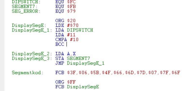 DisplaySeqE_1:LDA DIPSWITCH : load dip switch valueCMP #10 : check if >= 10 --> C=0 if A>=10LDA SEG_ERROR: load error symbol as default symbolBCC Store : if dipswitch value was >= 10, don't load symbolLDA A,X : come here if dispswitch < 10, load symbol 0-9Store:STA SEGMENT7 : store symbolJMP DisplaySeqE_1 : loop