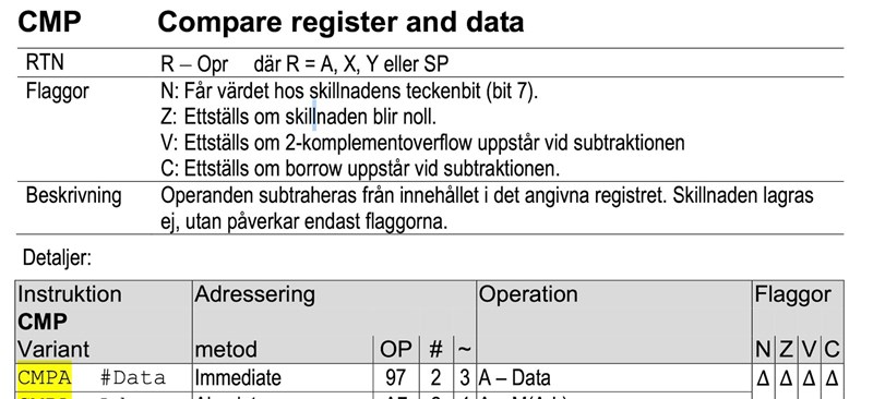 att sätta flaggan Z=1 (för alla andra A blir Z=0). Den kommer också sätta N=0, V=0 och C=0 om A=5 (om jag tolkade texten rätt).