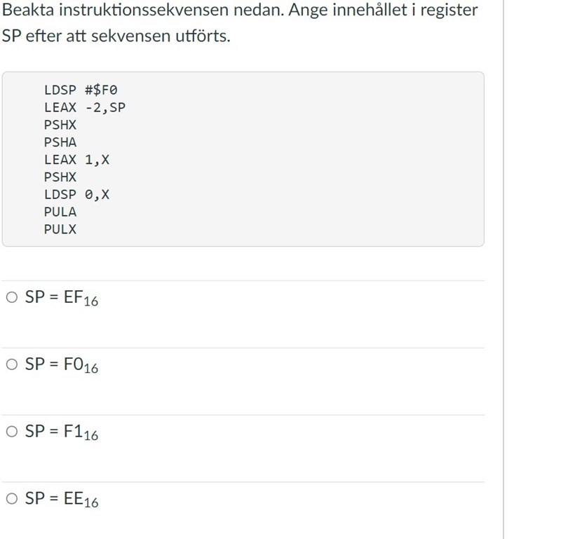 Programmeraren skrev:Första raden sätter SP till F0, Dvs stackpekaren pekar på minnesaddress F0. I uppgiften är det mest till för att du måste veta vad SP är från början för att kunna veta vad den är efter alla instruktionerna.