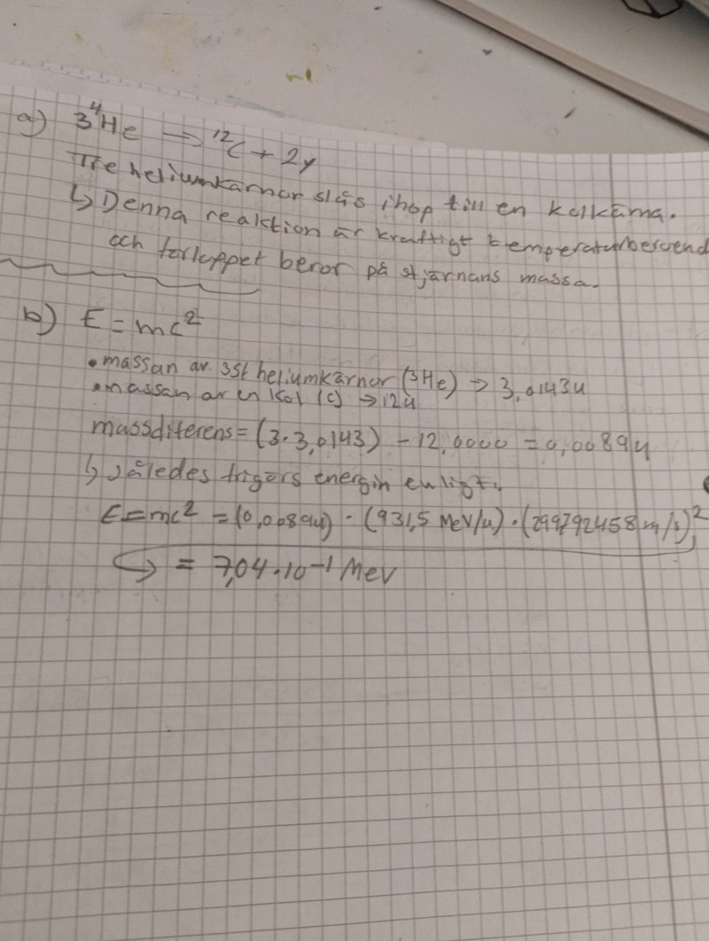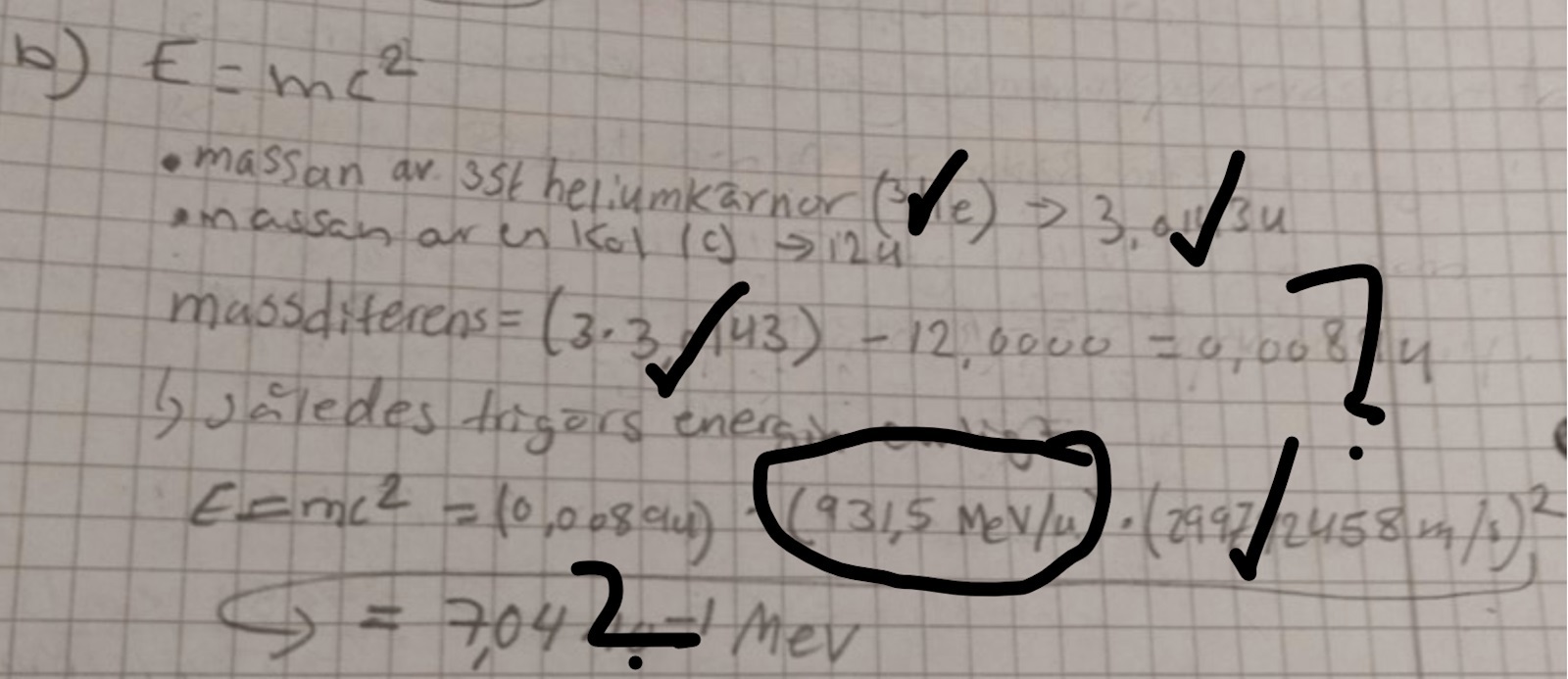 Men jag förstår fortfarande inte dina siffror för massdifferensen. Tyvärr har jag ingen formelsamling så jag kan kontrollera. Var hittar du värdet för heliumkärnans He-4 massa? Du skriver 3.016029u, men jag tycker att det borde vara någonstans kring 4u. Kan du klippa in en bild på tabellen i din formelsamling, så vi kan kontrollera?