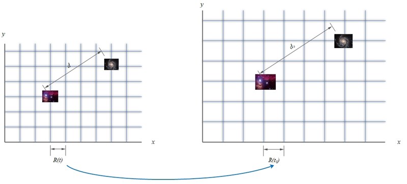 Ljus med våglängden sänds ut från en galax (t.ex. med koordinaterna 3,3 i bilden) vid tidpunkten . Vid en senare tidpunkt , när universum expanderat, har rutnätet som spänner upp universum blivit "större". Ljuset har färdats "sträckan" d, en sträcka som tänjts ut och blivit längre under tiden som ljuset har färdats på grund av expansionen (och når nu objektet i punkt 7,5).