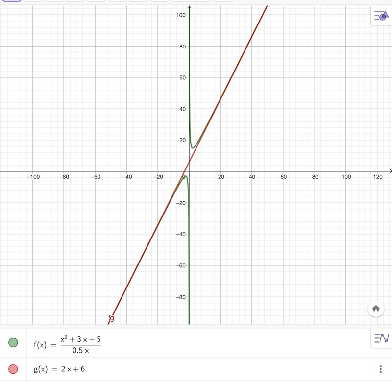 Vi ser att y = 2x + 6 är en asymptot då x går mot positiva (eller negativa) oändligheten, eftersom som 10/x går mot noll då x går mot positiva (eller negativa) oändligheten. Vi kan således se 10/x som r(x) i detta fall.