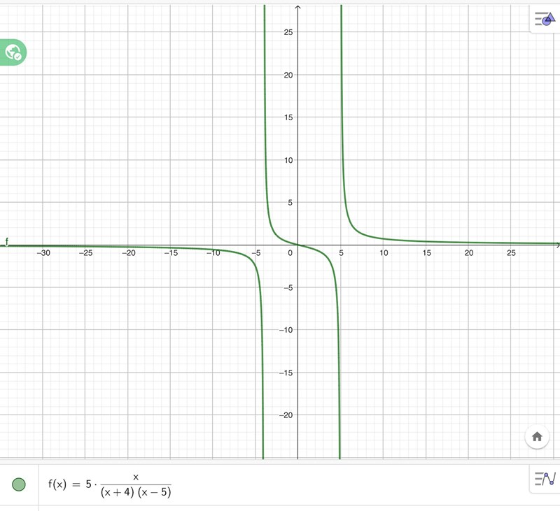 - två lodräta asymptoter i x=−4 och x=5 , samt