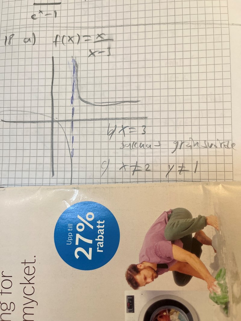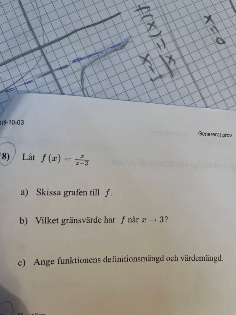 Jag ser att X får inte vara 3, hur ritar jag upp grafen asså ska jag markera asymptoten tex som jag gjort i blått och sen vad mer? Jag har kollat facit men förstår inte hur grafen ser ut så.