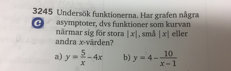 Jag har problem med uppgifter av denna typ. När det gäller a) tänkte jag att stora absX medför att 5/x blir så litet att den kan försummas, men -4x dominerar. För små absX gäller att 5/x dominerar men -4x kan försummas. I facit står det dock att -4x och y-axeln är asymptoter, jag är med på -4x, men förstår inte hur y-axeln uppkom.