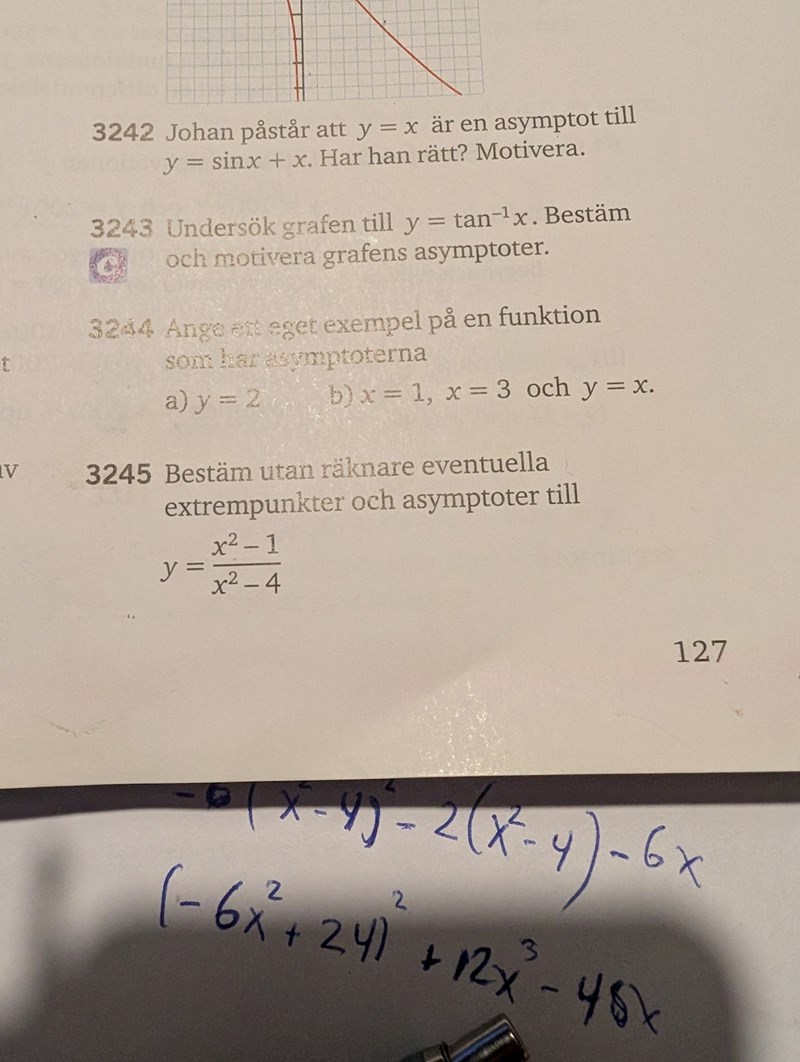 Jag tycker asymptoter är x= +- 2 och att extrempunkten är = 0.