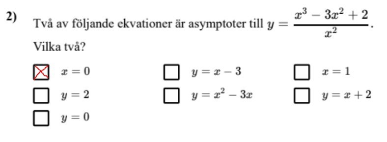 Jag vet att x=0 är en asymptot men vilken är den andra och varför ?
