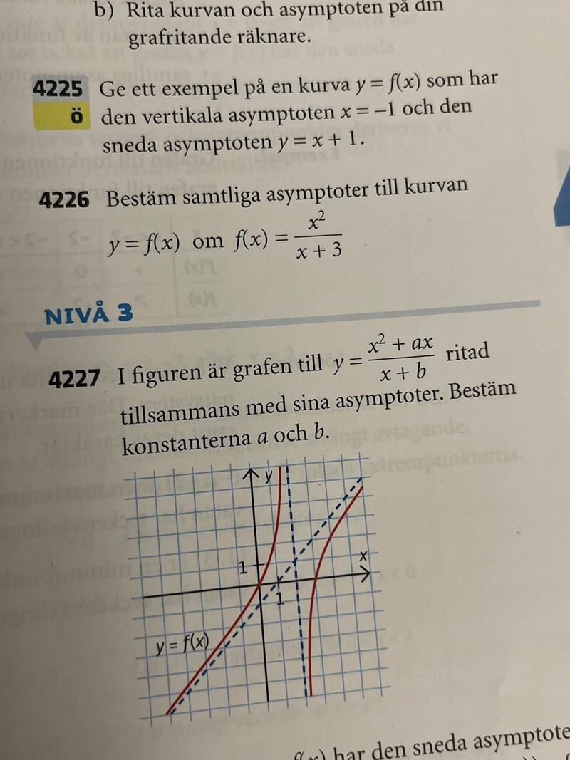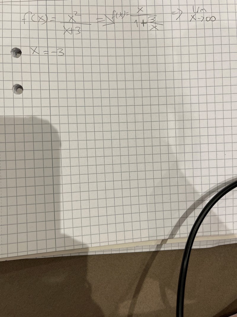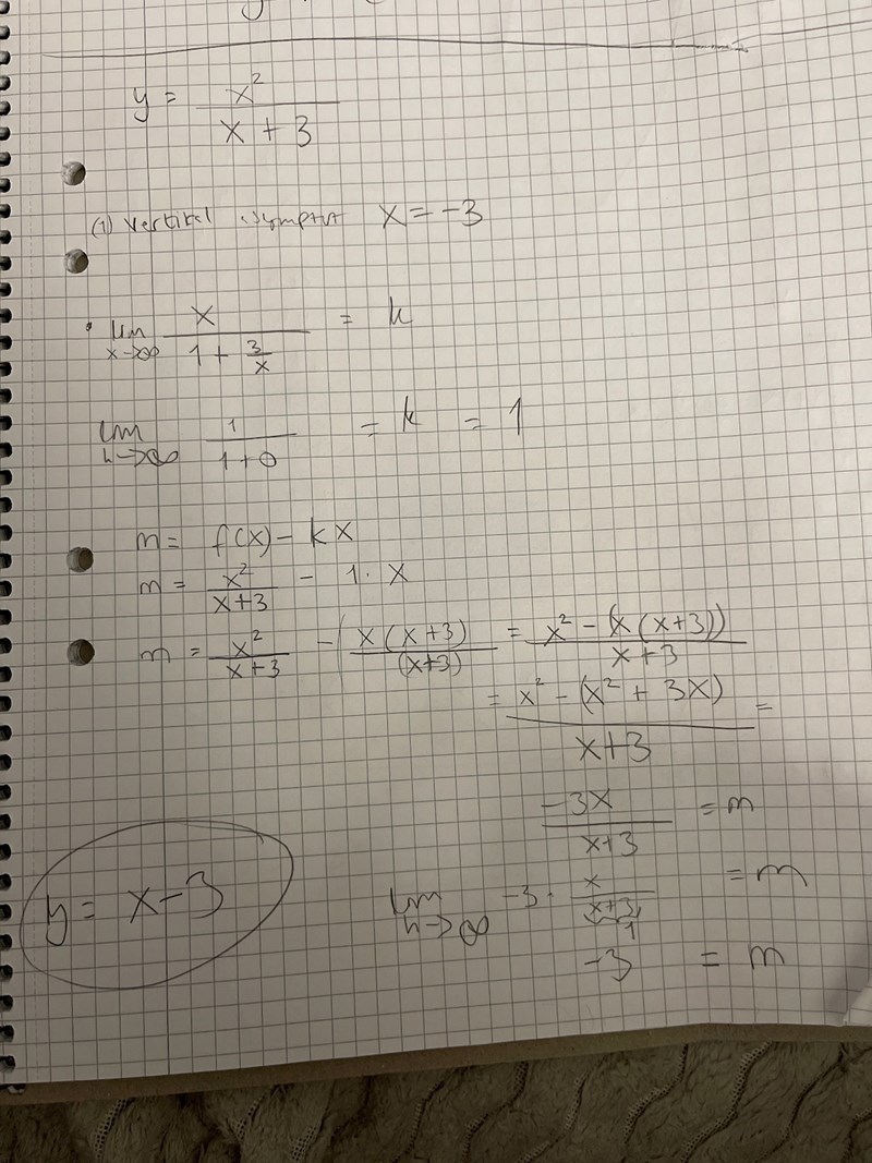 Hej! Jag lyckas förstå att vi har en vertikal asymptot då x=-3 .. Men jag förstår inte hur man kommer fram till den andra asymptoten.  Jag har skrivit av en lösning från vår genomgång idag i skolan men jag hängde inte med på tankesättet