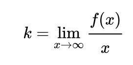 k = LIM f(x)/x = LIM (x/(1+3/x))/x = LIM 1/(1+3/x) = 1  (eftersom 3/x går mot 0)