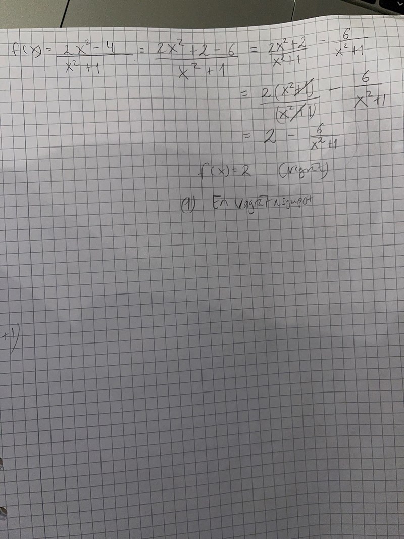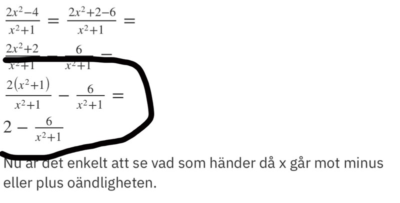 Är du med på att 2x2+2-6 = 2x2-4? Är du med på att (2x2+2)/(x2+1) = 2 och att -4/(x2+1) går mot 0 när x går mot oändligheten (positiv eller negativ)?