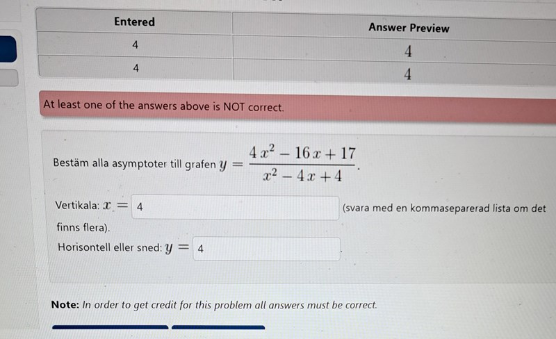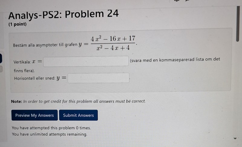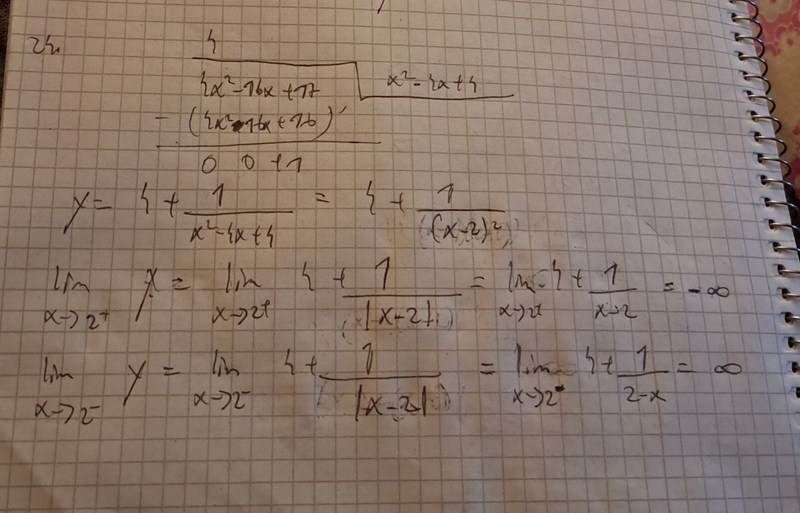 Jag har lite problem att bestämma vad gränsvärdet går mot när jag kollar vad som händer då x går mot 2 från positiv och negativ sida. Asså nämnaren lär bli väldigt lite är min gissning och då blir kvoten något ändligt stort vilket är lika med oändligheten? Eftersom vi har en positiv nämnaren så är min gissning att vi går mot positiv oändlighet från båda positiv och negativ riktning. Kan man tänka såhär?