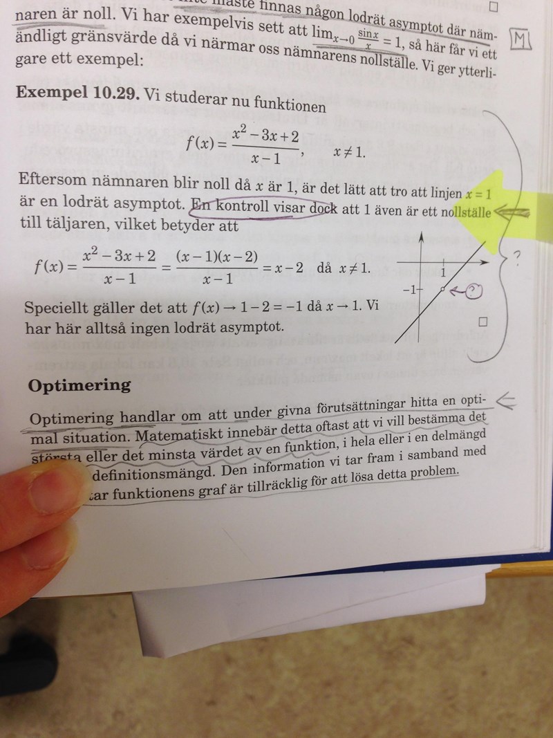 Där den gula pilen ör "det är lätt att tro att linjen x=1 är en lodrät asymptot".