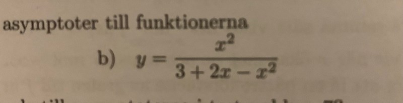 vågrät asymptot? Jag skrev om nämnaren till (x-3)(x+1). Sen i min anteckning ovan så bryter jag ut x från täljaren och får svar y=1 men facit visar y=-1, var har jag gjort fel?