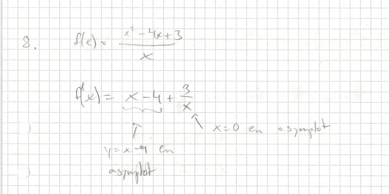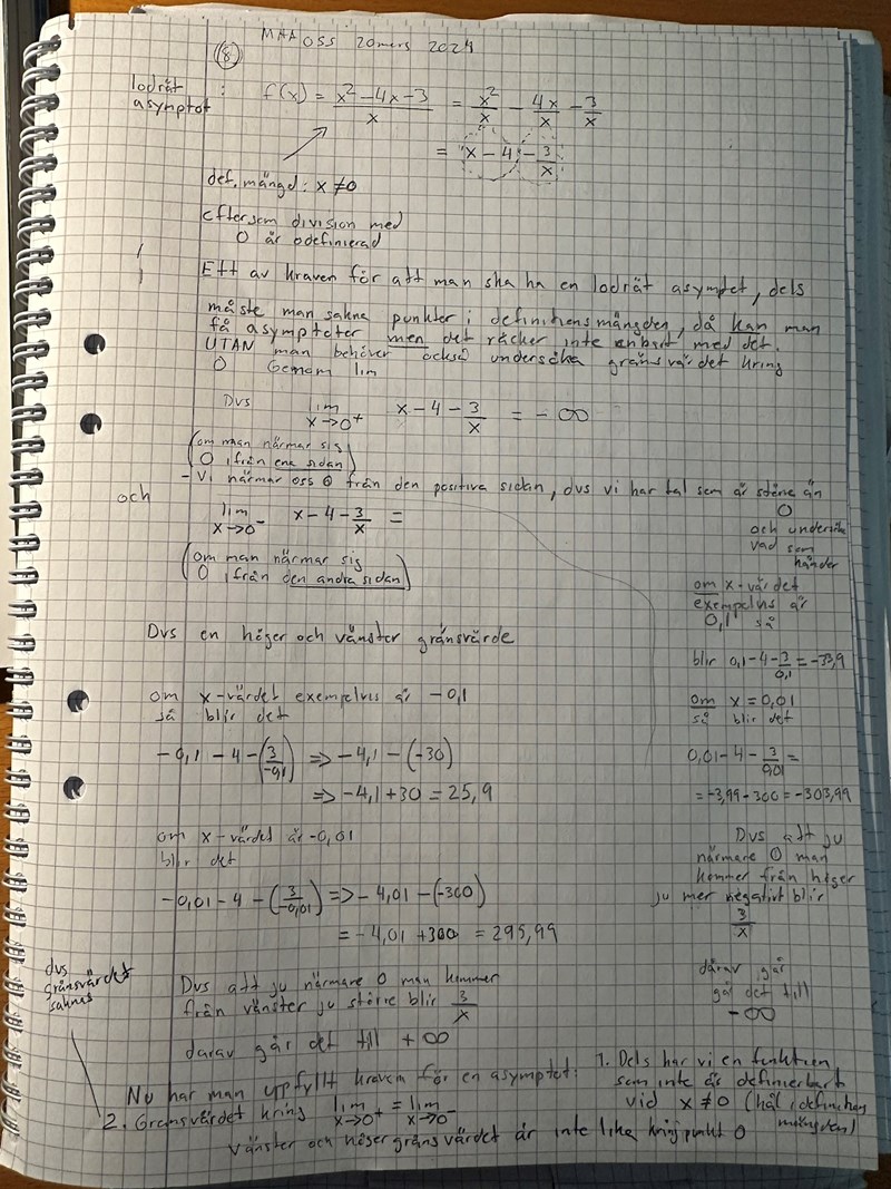 Var det så att jag formulerade mig fel genom att skriva ut -3/x var en asymptot när jag vara borde ha skrivit att x i dess nämnare var en lodrätt asymptot? Var mina beräkningar fel pga av det?
