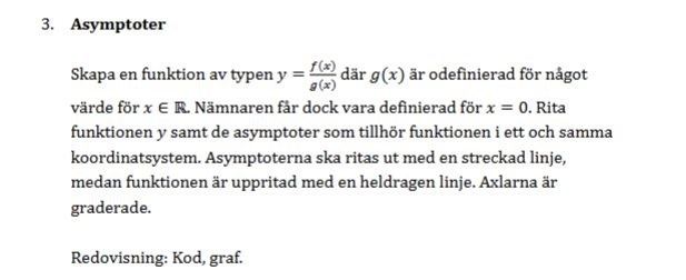 Kanske är legend lite intetsägande? "Funktion y" är ju inte så jättespännande. Kanske faktiskt skriva ut funktionens definition istället? Uppgiften säger ju heller inte att du inte får skriva ut att det är en horisontell asymptot y=0 och två vertikala x=+/-1.