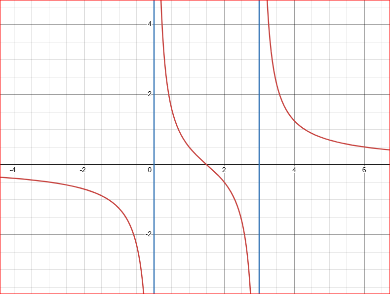 Det betyder att vi har två vertikala asymptoter, nämligen x = 0 och x = 3.