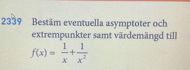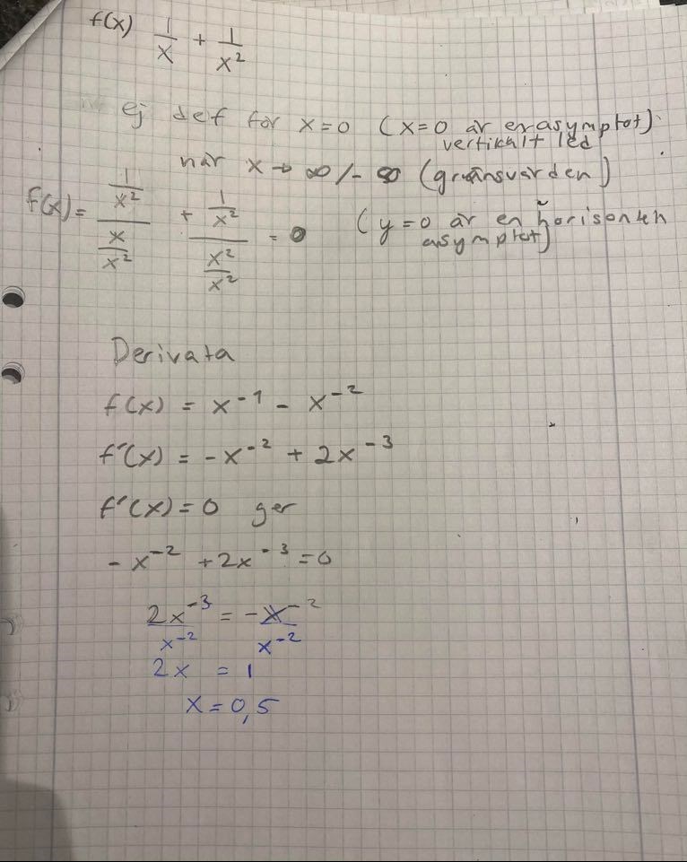 så x= 0 är en vertikal komposant då grafen blir vertikal? den vågräta asymptoten är väl -1 eftersom det är gränsvärdet? räknadet det genom att dela med x^2