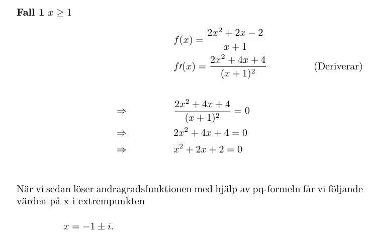 En annan fråga gällande samma uppgift, jag ska även hitta kurvans extrempunkter och i ett utav fallen blev x-värdet ett komplext tal. Hur bör jag mig då åt när jag ska hitta y-värdet? Förstår att jag även behöver detta när jag ska undersöka konvexitegenskaperna.