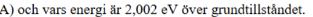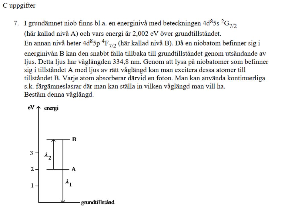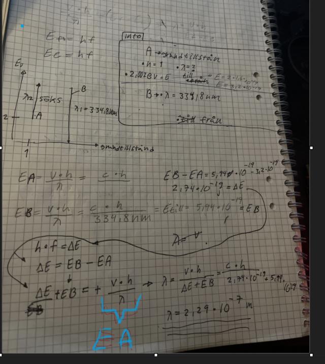 Så fotonenergin som efterfrågas är 3,703 - 2,002 = 1,701 eV. Och då hamnar jag på λ₂ = 728,8 nm.