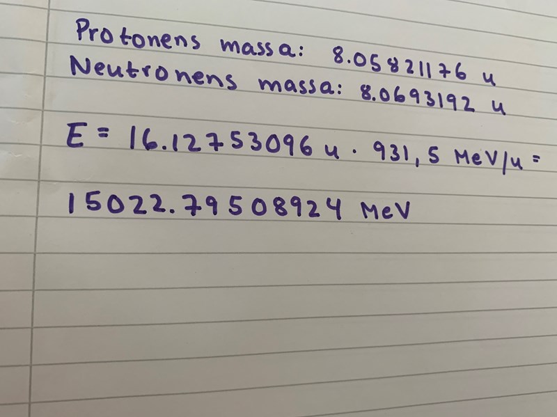 Teraeagle skrev:Börja med att räkna ut den totala massan hos 8 fria protoner och 8 fria neutroner samt hur stor massa energin 127,6 MeV motsvarar. Skillnaden mellan dessa värden motsvarar nuklidens massa.