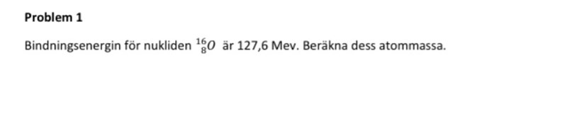 Börja med att räkna ut den totala massan hos 8 fria protoner och 8 fria neutroner samt hur stor massa energin 127,6 MeV motsvarar. Skillnaden mellan dessa värden motsvarar nuklidens massa.