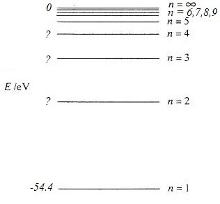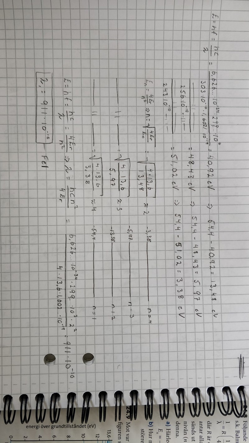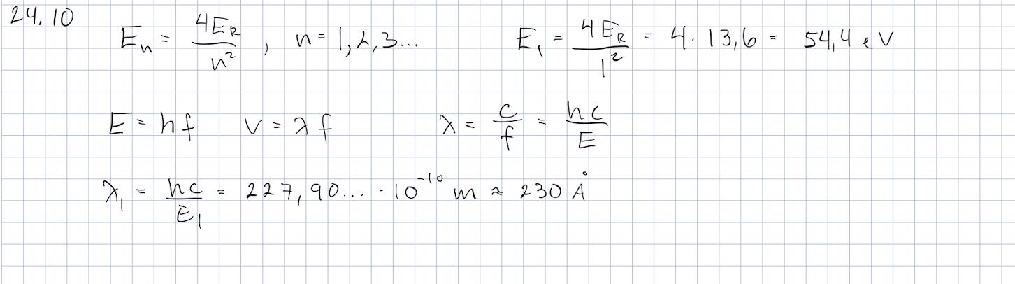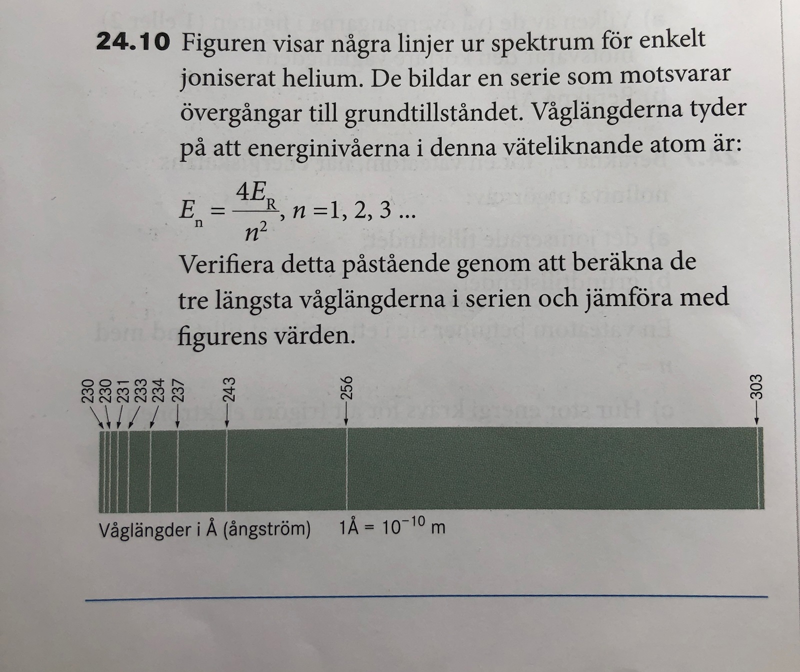 Tänk på att joniseringsenergin för enkelt joniserat Helium är och alltså fyra gånger så stort som för väte. Du har satt och tagit reda på att motsvarar joniseringsenergin. Detta framkommer direkt av bilden och är inte vad de bett dig göra. Vi skulle alltså ha som följer enligt den enkla modellen:
