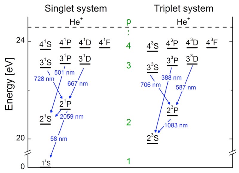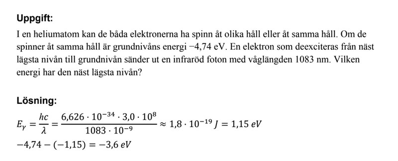 Uppgiften handlar om två exciterade tillstånd där båda elektronerna har parallell spin (triplet-tillstånd, orto-helium). Triplet-tillståndet har ett lägsta tillstånd 1s 2s som är metastabilt. Man kan kalla det grundtillståndet av orto-helium, det har en jonisationsenergi på 4,74 eV.
