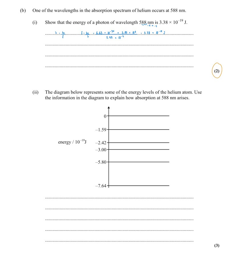 Vad är det egentligen som händer när helium absorberar 3.38 * 10 -19 J ? Förklara i ord.