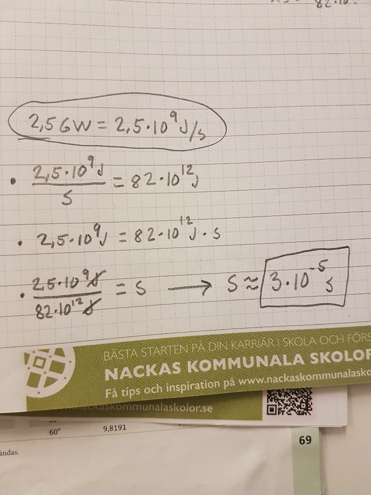 Smaragdalena skrev:Du krånglar till det för dig. Du vet att det frigörs 82 TJ när 1 kg uran klyvs, och att reaktorn har en totaleffekt på 2,5 GW. Vad har du för samband mellan W och J?