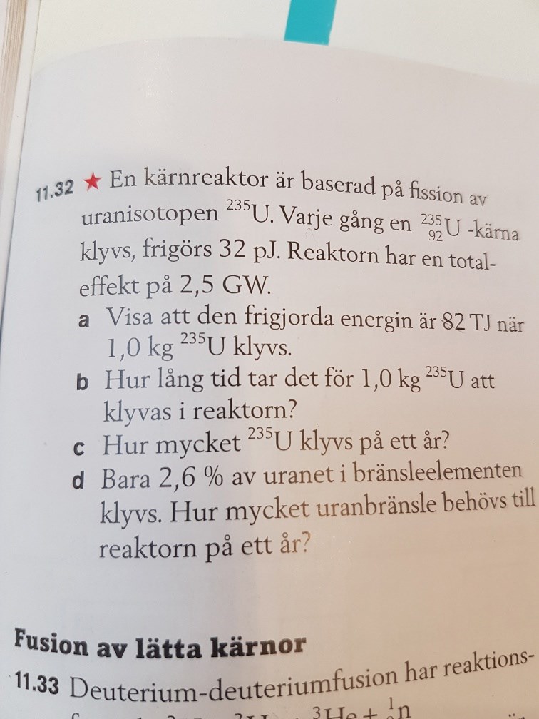 Undrar hur jag ska lösa b) ? Jag tänkte att man kunde göra en ekvation av energin för 1kg U-235 och effekten för kraftverket likt nedan, men det fungerade visst icke..