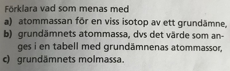 Smaragdalena skrev:Vad står det om "atommassa" för en viss isotop i din bok? Det bör stå en mycket tydlig förklaring - det är det enklaste av de tre begreppen i din fråga.