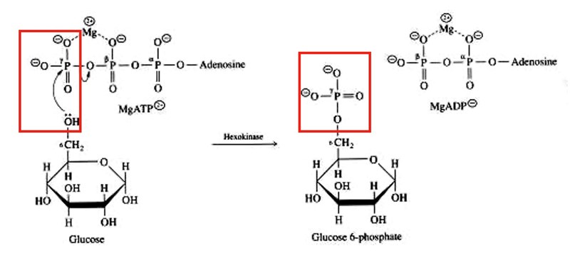 Rent kemiskt är det glukosmolekylens hydroxigrupp på kol 6 som anfaller fosforatomen i ATP, så det som adderas till denna hydroxigrupp är en fosforylgrupp, men efter adderingen bildas en fosfatgrupp.