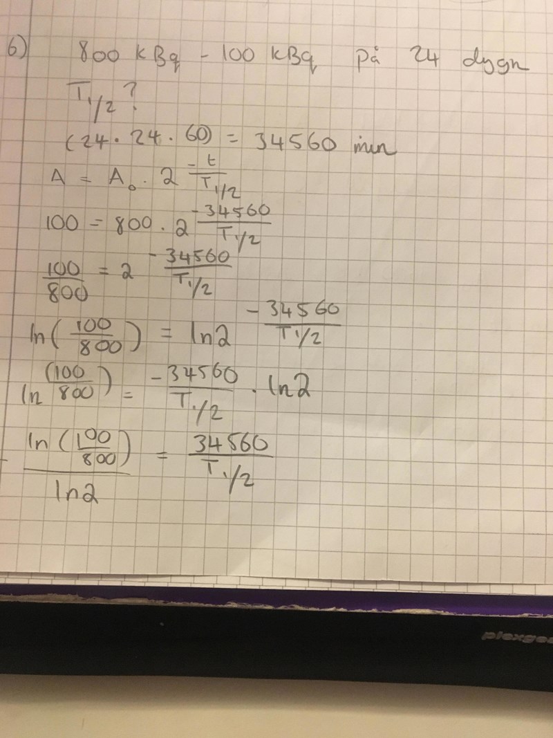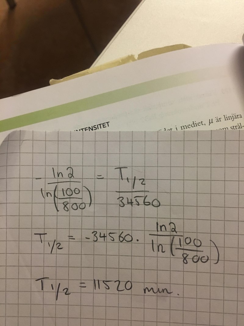 Frågan: aktiviteten från ett radioaktivt ämne minskar från 800 kbq till 100 kbq på 24 dygn. Bestäm halveringstiden.