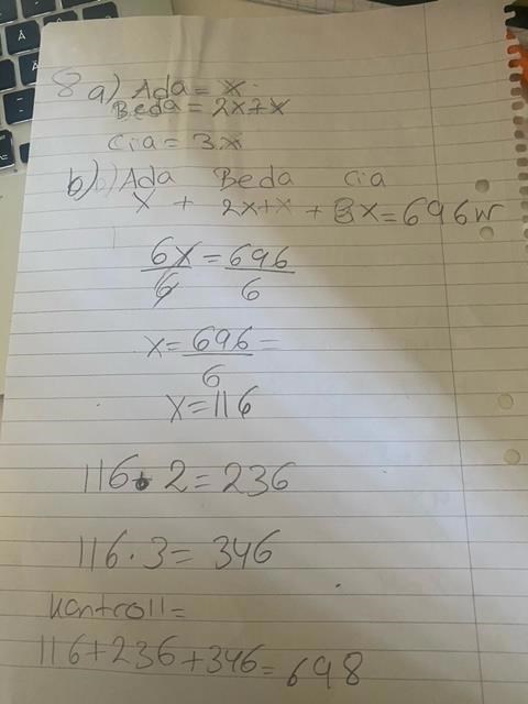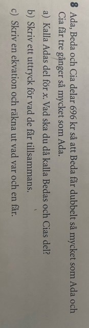 bea får dubbelt så mycket som ada men det är väl då 2x+x?