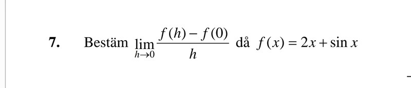 Eftersom f(x) = 2x + sin(x) så behöver du bara derivera till f'(x) och sedan beräkna värdet av f'(0).