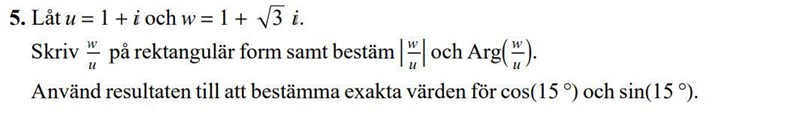 jag har alltså hittat (tror jag) den rektangulära formen, argumentet (vinklarna) och absolutbeloppet. Dock kan jag inte förstå hur detta kan nå mig till ett exakt värde för Cos(15) och Sin(15). Jag hittar inte heller någon liknande uppgift på internet / Matematik origo 4.