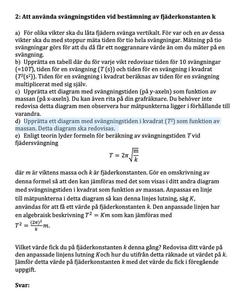 Jag vet inte hur man ska svara på denna del faktiskt. Att jag har fått en sån stor fel i mitt svar (k≈14N/m), vad kan det bero på? Här var det då jag använde svängningstiden i kvadrat dividerat med massan som svaret blev så avvikande. Jag tänker att felen fortplantar sig när man har en tid som är större än 1 och det ska sedan kvadreras, och sen divideras med massan. Då blir lutningen för stor (fjäderkonstanten). Vad tror ni, hur ska man motivera sitt svar här?