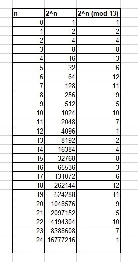 Ursäkta men varför skriver du två produkter och sen skriver konguent med 2^3 konguent med 8 mod 13? Förstår ej hela den raden.