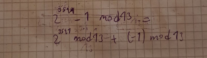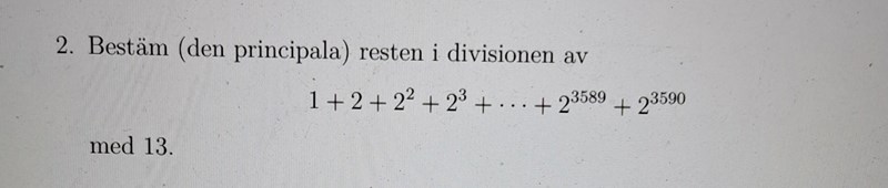Som jag ser så får vi en rest med fördubbling av 2 om vi tittar på 1-12 så 2^(3591)-1 mod13 har en rest på 2*x. Då får jag 2^(3591)/2mod13=x vilket ger oss x=2^3590. Så resten är 2^3590?