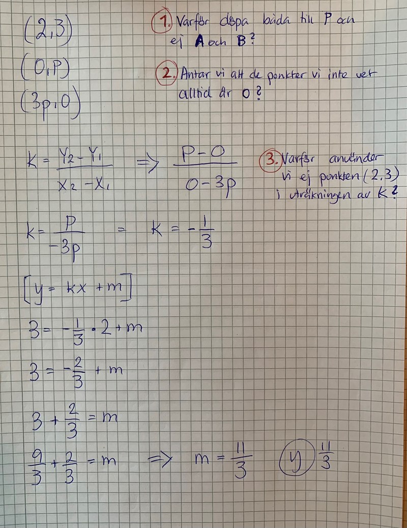 3.) Din lärare använde inte punken (2,3) för att beräkna k. Jag gjorde så här istället: