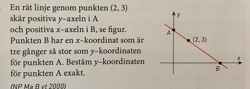 1.) Du kan precis lika gärna säga att A har koordinaterna (0,a) och att B har koordinaterna (b,0) och sedan skriva att a=3b (så gjorde jag när jag löste uppgiften). Den som har gjort din lösning har tagit en genväg.