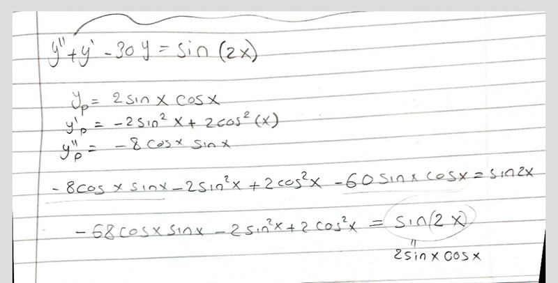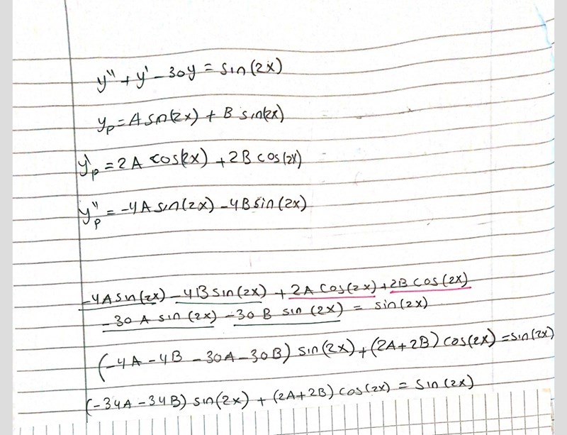 Smaragdalena skrev:Ansätt yp = A sin(2x) + B sin(2x). Derivera 2 ggr och sätt in i diffekvationen.