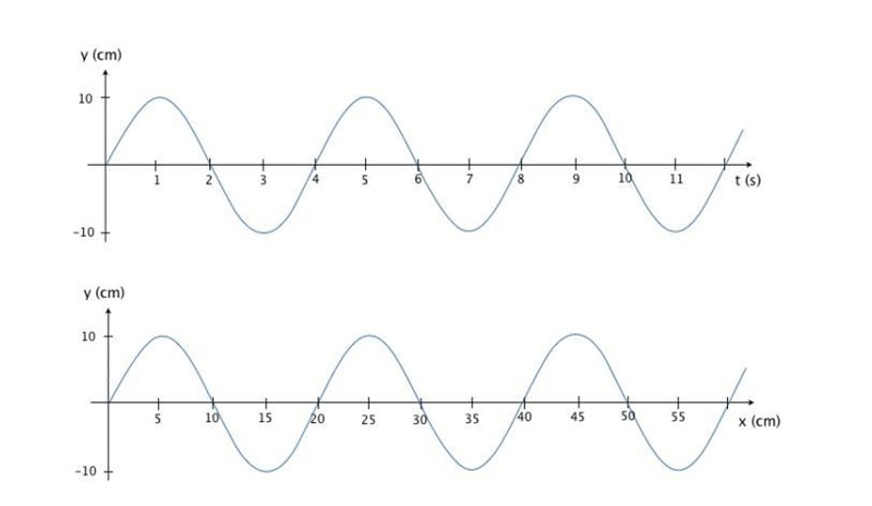 Den ena grafen är amplitud mot tid, den andra amplitud mot position (x). Jag behöver hitta λ, f, k, ω.